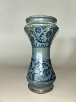 ALBARELLE en faïence à décor de volutes fleuries. Espagne, XVIIème siècle. H. 27 cm. Accidents, manques.