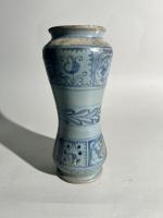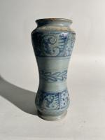 ALBARELLE en faïence à décor de frises, feuillages et médaillons. Espagne, XVIIème siècle. H. 28 cm. Restaurations.