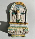 BENITIER en faïence à décor d'un Christ en croix. Sicile,...