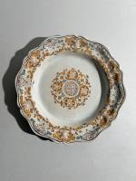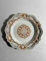 PLAT accidenté et deux assiettes en faïence polychrome à forme chantourné à décor polychrome géométrique. Turin (?), époque XVIIIème siècle. Accidents.
