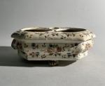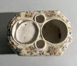 Huilier-vinaigrier de forme rectangulaire à pans coupés en faïence polychrome. Moustiers, époque XVIIIème siècle. 7 x 21 x 13 cm.