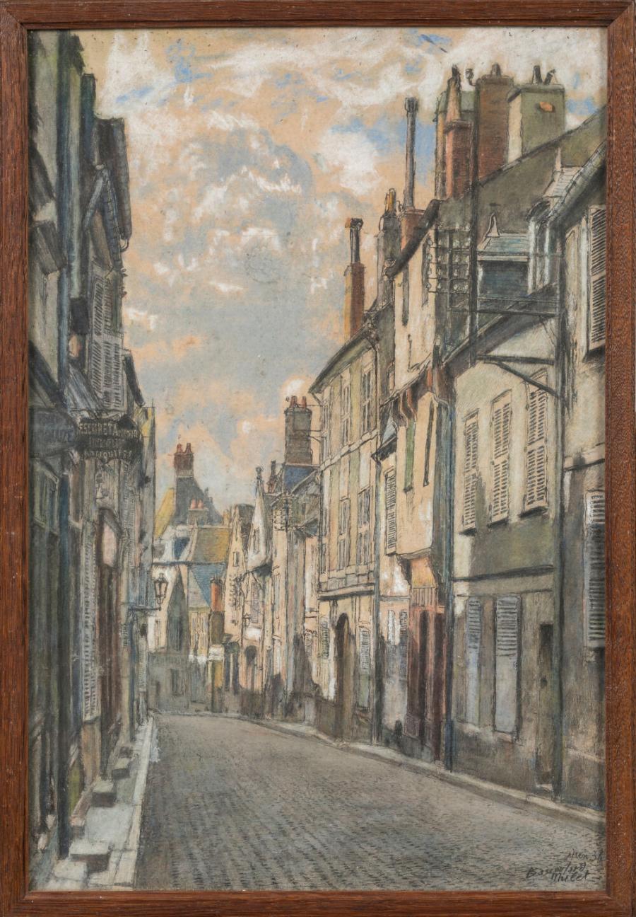 Marcel BASCOULARD (1913-1978), « Vue de la rue Bourbonnoux à Bourges », aquarelle et gouache signée et datée 36 à droite.