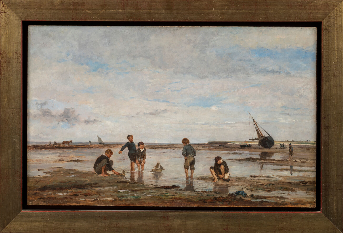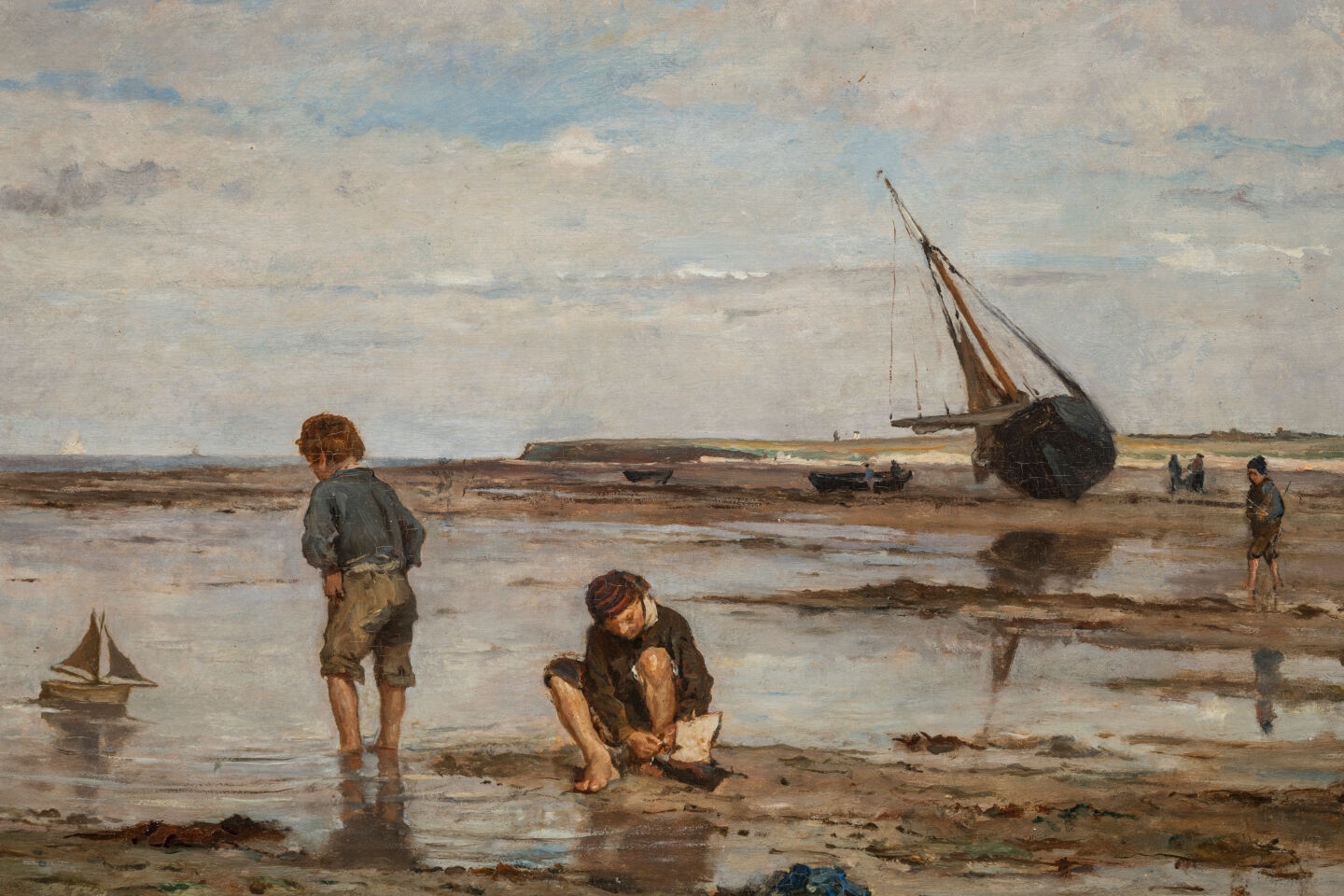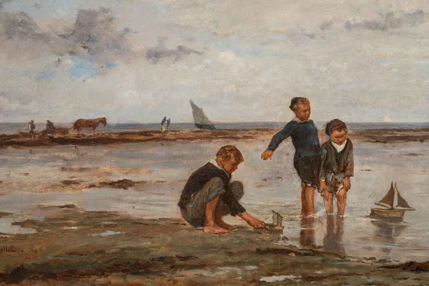 THIOLLET. "Alexandre, jeu d'enfants à Villerville". Huile sur panneau signée en bas à gauche. 43 x 73 cm