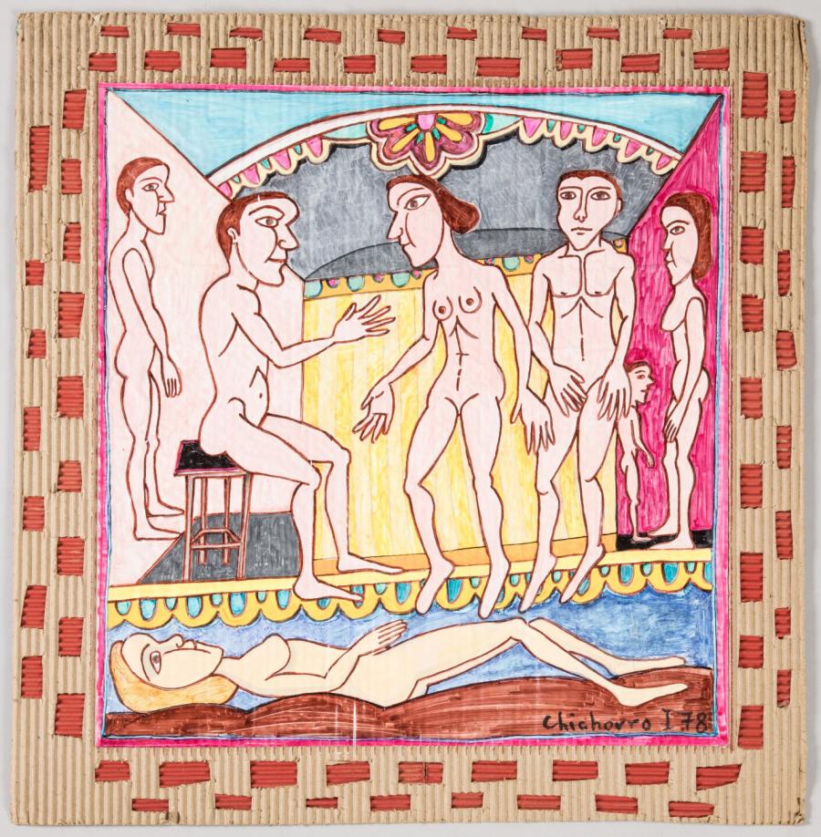 Mario CHICHORRO (1932-2023). Groupe dans une maison, 1978. Peinture sur papier collé en plein carton ondulé. Signé et...