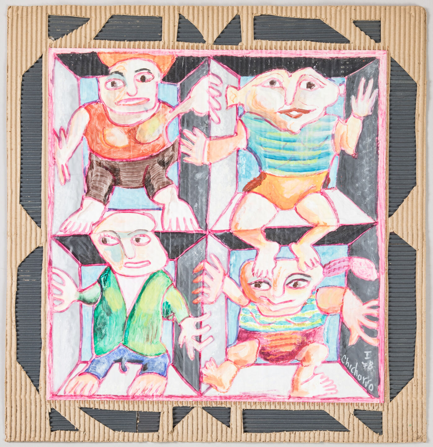 Peinture sur papier collé en plein carton ondulé.