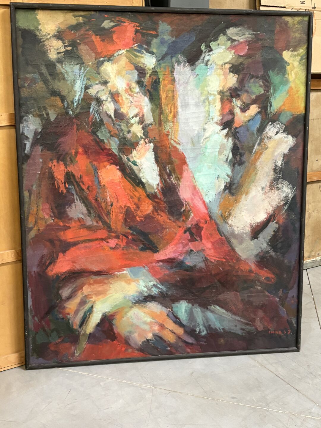 Jean-Noël IMAR (1943-2023). Femme au châle rouge les bras croisés. Huile sur toile signée et datée 67 en bas à droite. 150 x 124 cm.