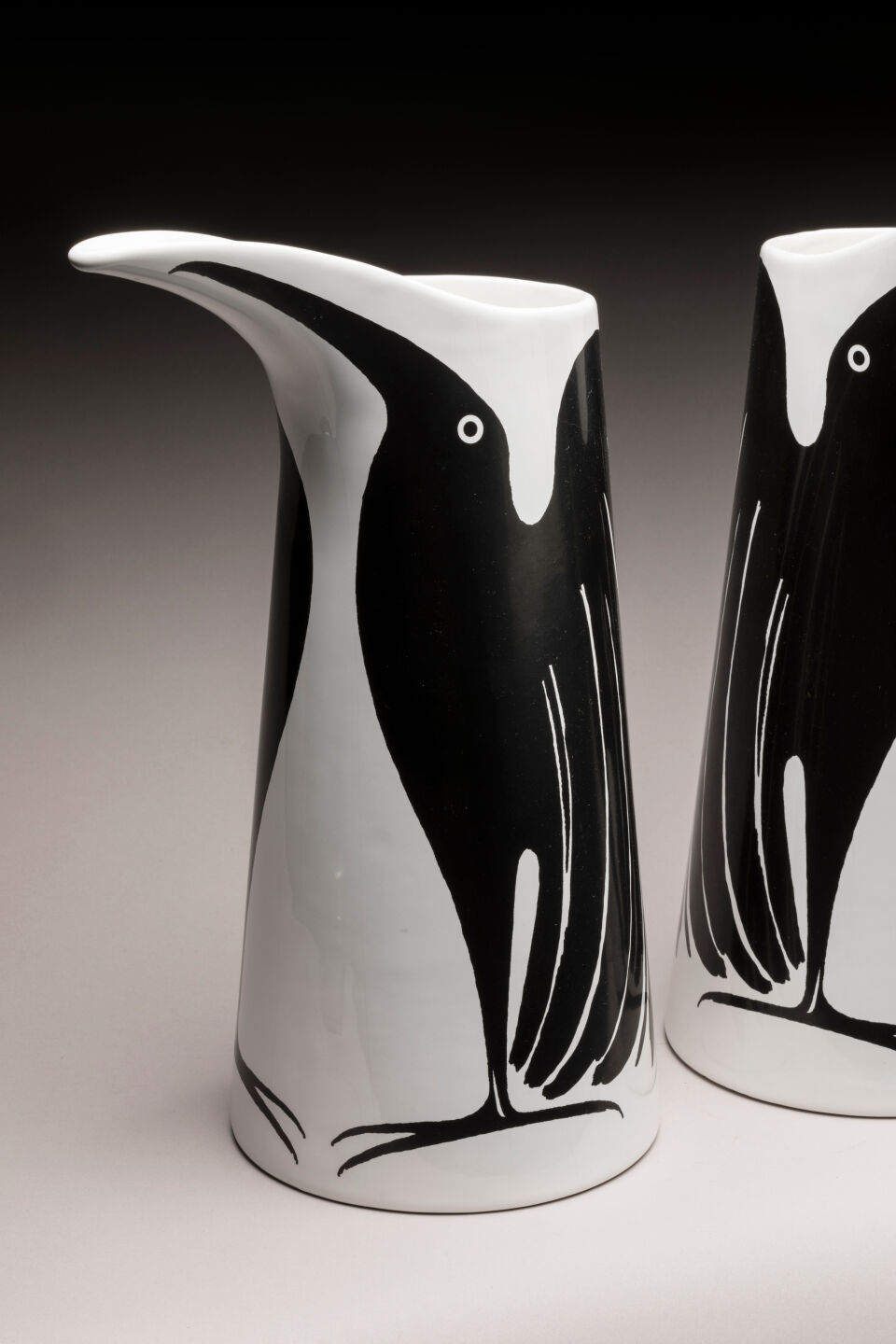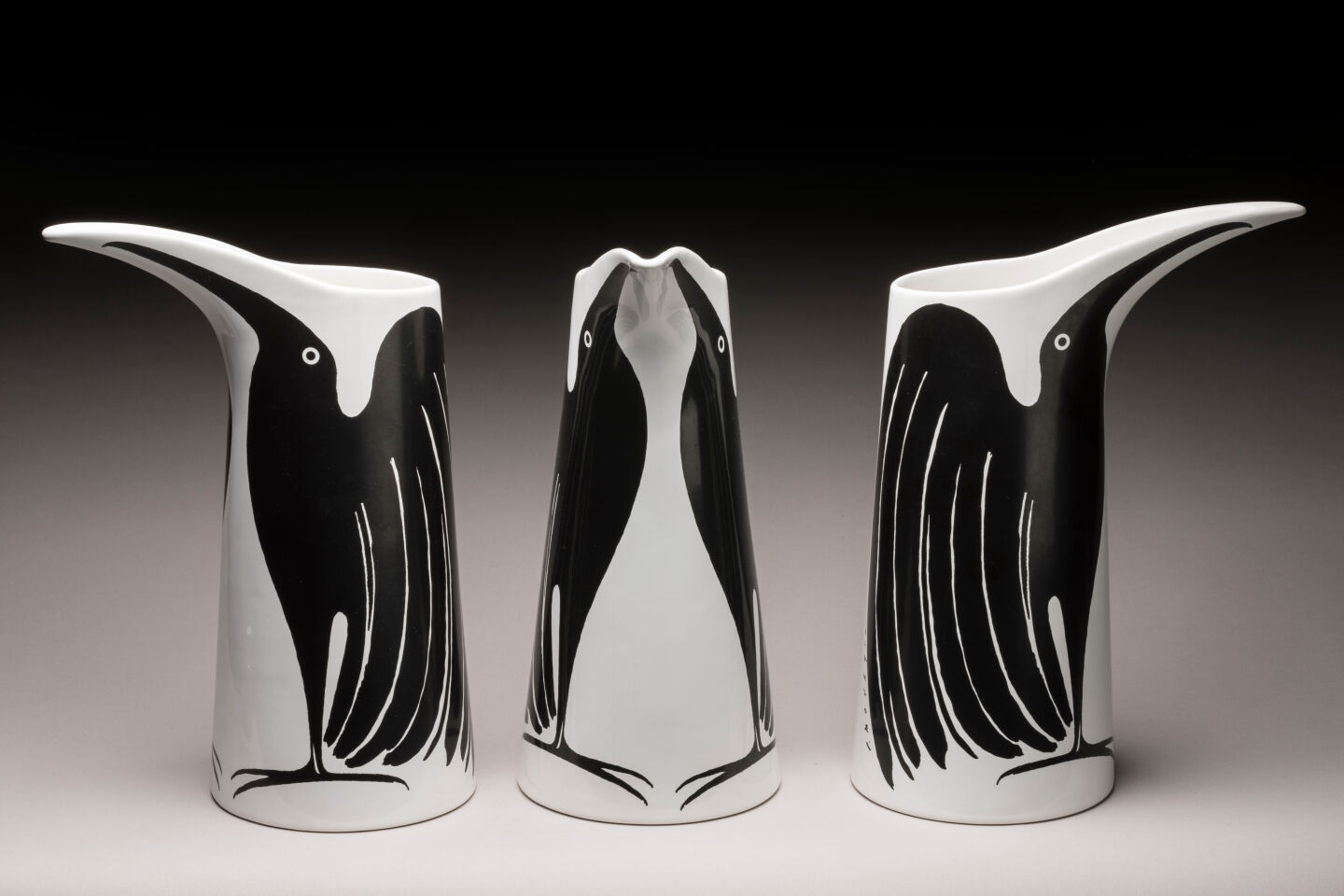 Série de trois vases verseuses en céramique à déco émaillé noir d'oiseau au long bec. Léger défaut de cuisson sur une aile. Édition Cinna. H. 36 cm