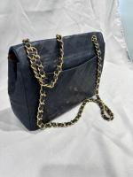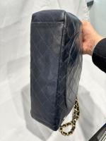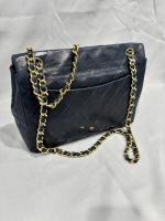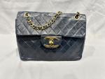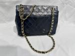 CHANEL SAC A MAIN Timeless Jumbo, en cuir bleu nuit agrément en métal doré chaine ajustable en métal doré et lanière de cuir. Bon état général, petites usures des angles. L : 30 cm