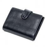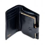 CHANEL - PORTEFEUILLE modèle "Compact" en cuir d'agneau bleu marine, double C matelassé piqué, fermeture à pression découvrant un portemonnaie et des rangements pour cartes, agréments en métal doré. Numéroté. 12 x 9 x 2 cm.