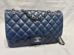 CHANEL SAC A MAIN Timeless Jumbo noir Giant en cuir bleu de veau matelassé, agréments en métal argenté.