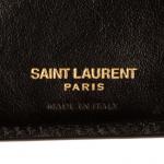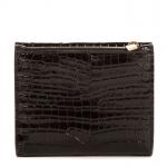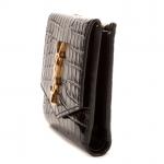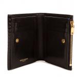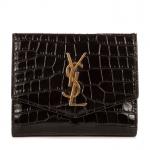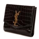 YVES SAINT-LAURENT - PORTEFEUILLE modèle "Cassandre envelope" en cuir embossé noir façon crocodile, comprenant une partie portemonnaie zippé et une partie portefeuille, en métal doré, la partie portefeuille à pression avec espaces pour les cartes et poche avant sous un rabat à pression siglé "YSL. Numéroté. 12 x 10 x 2cm. Très bon état général, légères usures et griffures du cuir intérieur.