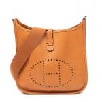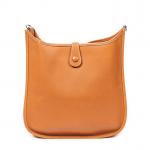 HERMES - SAC à main modèle "Evelyne I" PM en cuir de veau couleur gold, bandoulière en tissu, agréments en palladium. Lettre K dans un carré. 29 x 30 x 8 cm. Excellent état général, infimes usures et taches.