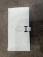 HERMES portefeuille modèle BEARN en cuir de chèvre Mysore couleur "bleu brume", bijouterie en palladium. Marquage X. État neuf réalisé en 2023. Dim : 17 x 9 cm