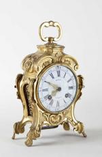 | CARTEL à poser en bronze doré de forme violonée à décor en bas relief de volutes, rocailles, croisillons et feuillages, posant sur quatre pieds cambrés, poignée de transport au frétel, cadran émaillé à chiffres romains et arabes. Signé MOISY à Paris. Poinçon au C couronné. Epoque Louis XV. 28 x 17,5 x 10 cm. |