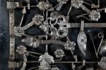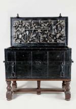 | Large COFFRE en acier laqué noir à décor en façade latérales de poignées de levage et crochets en façade principale. Plateau en velours rouge cramoisi à quadrillage et de clous de fer, serrure à complication à quatorze pièces, décoré de lambrequins et fleurs. Nuremberg, époque XVIIème siècle. 51 x 108 x 56 cm. |
