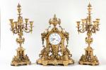 GARNITURE DE CHEMINEE en bronze doré comprenant une pendule et deux candélabres à sept bras de lumière, à décor de vase fleuri, corne d'abondance, acanthes et guirlandes de fleurs. Mouvement émaillé signé L. CHARVET aîné Horloger de la Ville Lyon. Epoque deuxième moitié du XIXème siècle. Pendule : 56 x 42 x 23 cm. Candélabres : 70 x 25 cm.
