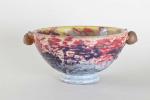 | DAUM Nancy. Coupe évasée en verre gravé à l'acide et poudres vitrifiées à décor de feuilles de vignes dans les tons bleu marine et feuilles rouges sur fond beige nuancé avec décor interne gravé. Quelques grappes en semi-relief et deux escargots en application en verre grisé. Infime manque sur une des cornes d'un escargot. Signée. H. 11 cm. D. 21 cm. |